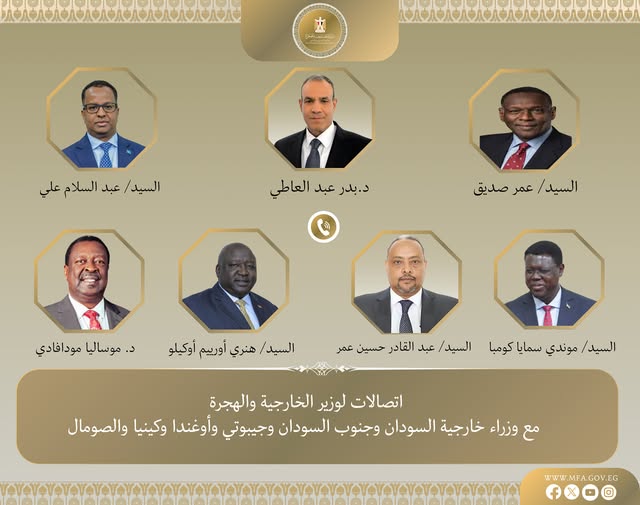 أجرى الدكتور بدر عبد العاطي وزير الخارجية والهجرة وشئون المصريين بالخارج سلسلة من الاتصالات، اليوم الخميس الموافق 21 أغسطس 2025 مع نظرائه في كل من السودان وجنوب السودان وجيبوتي وأوغندا وكينيا والصومال.