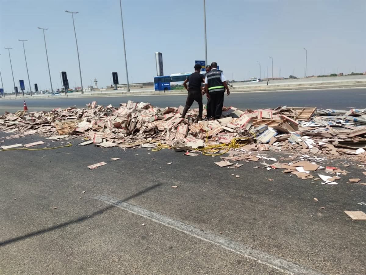 وقد نجحت قوات المرور في رفع الحمولة المتناثرة من نهر الطريق والتعامل مع الموقف سريعًا، لضمان عودة الحركة المرورية لطبيعتها دون وقوع إصابات بشرية.