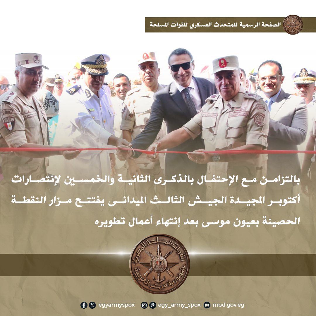 إفتتح اللواء أ ح أحمد مهدى سرحان قائد الجيش الثالث الميدانى مزار النقطة الحصينة بعيون موسى بعد الإنتهاء من أعمال تطويره ورفع كفاءته بما يتماشى مع الأهمية التاريخية للموقع، وذلك بحضور اللواء أ ح طارق حامد الشاذلى محافظ السويس وعدد من القيادات الأمنية والتنفيذية بالمحافظة ورئيس جامعة الجلالة وعدد من شيوخ وعواقل سيناء والإعلاميين.
