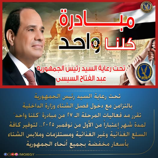 فى إطار توجيهات القيادة السياسية لإتخاذ كافة الإجراءات اللازمة لدعم منظومة الحماية الإجتماعية للمواطنين .. تحت رعاية رئيس الجمهورية.. وزارة الداخلية تقرر مد فعاليات المرحلة الـ 27 من مبادرة (كلنا واحد) لمدة شهر إعتباراً من الأول من نوفمبر 2025 لتوفير كافة مستلزمات الأسرة المصرية من السلع الغذائية وغير الغذائية بجودة عالية وبأسعار مخفضة بنسبة تصل إلى 40 % وذلك بالتنسيق مع مختلف قطاعات الوزارة ومديريات الأمن على مستوى الجمهورية بالمنافذ والسرادقات الموضحة على الموقع الرسمى لوزارة الداخلية (moi.gov.eg).